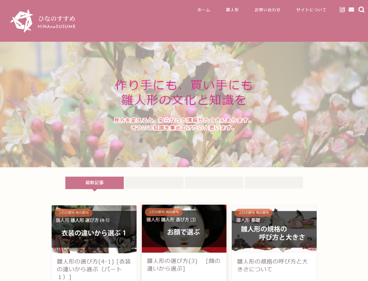 生産者、卸売問屋、小売店、消費者。どの立場の人間も、同じ情報を得ることができるようにしたい。 今はほとんどの業界において基礎知識・基礎技術がインターネットで調べることができるようになりました。 人形業界は、「隠しているわけではないのに周知される機会がない」という状態で、そのほとんどがインターネット上にはありません。これらをブログやサイトなどで広めていく事を「ひなのすすめ」の目的としています。